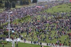 Карэспандэнты Свабоды ацэньваюць колькасьць людзей на маршы пратэсту ў Менску ў дзясяткі тысяч. Плякатаў у пратэстоўцаў мала, затое шмат нацыянальных сьцягоў і сьцягоў мікрараёнаў. Ёсьць партрэты Ціханоўскай, у тым ліку з подпісам «Сьвета ў канцы тунэлю».