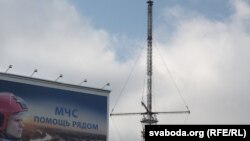 Позна ўвечары «азотаўцы» пайшлі пад тэлевежу на вуліцы Горкага. Увышыню яна 254 мэтры, агароджаная, але не з усіх бакоў. Падысьці да яе нічога не перашкаджала. Бязь нейкіх прыстасаваньняў за 50 хвілін абодва ўскараскаліся больш як на палову вышыні. Там і замацавалі бел-чырвона-белы сьцяг. Сфатаграфаваць не змаглі – было вельмі цёмна.