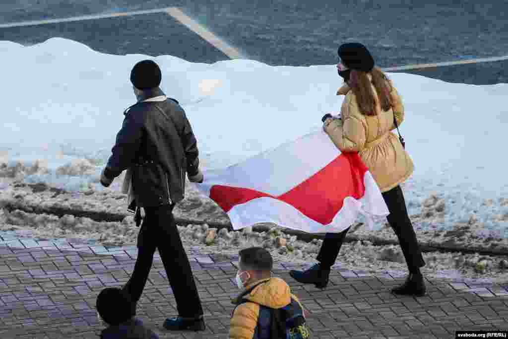 Людзі нясуць сьцяг каля парку Чалюскінцаў.
