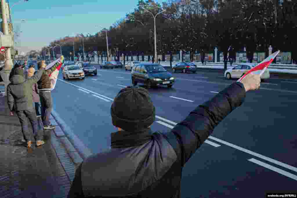 Каля парку Чалюскінцаў насупраць калёны аўтамабіляў з чырвона-зялёнымі сьцягамі зьявіўся невялікі «ланцуг салідарнасьці» зь бел-чырвона-белым сьцягам.