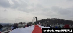 Яны несьлі 20-мэтровы беларускі сьцяг. Яшчэ адзін сьцяг запусьцілі на дроне, і ён суправаджаў калёну цягам усяго шэсьця.
