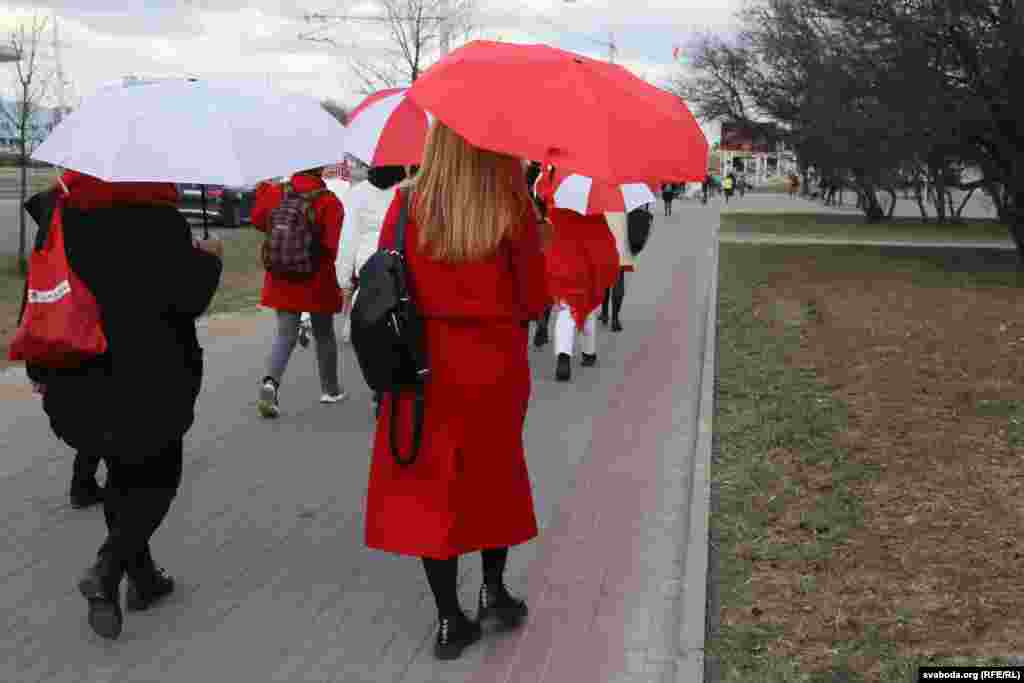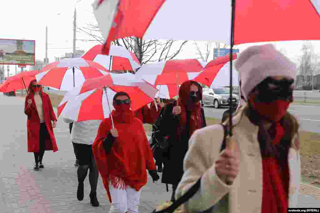 Гэтым разам жанчыны зь бел-чырвона-белымі парасонамі прайшлі па менскім праспэкце Пераможцаў.