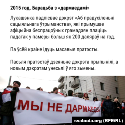 2 красавіка 2015 году Лукашэнка падпісаў дэкрэт «Аб прадухіленьні сацыяльнага ўтрыманства». Паводле гэтага дакумэнту грамадзяне, якія не працуюць афіцыйна, мусяць заплаціць дзяржаве 20 базавых велічыняў (каля 200 даляраў на той момант).