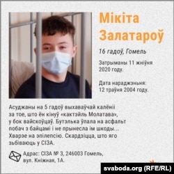 У Гомлі непаўналетняга палітвязьня Мікіту Залатарова пераарыштавалі ў новай крымінальнай справе за напад на супрацоўніка СІЗА, паведамілі «Сильные новости».