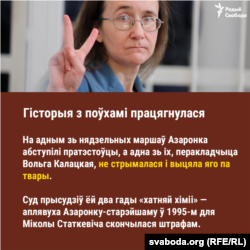 «Праваахоўнікі» шукалі Калацкую два месяцы, затрымалі яе толькі 15 студзеня 2021 году. У канцы сакавіка адбыўся кароткі суд, на якім перакладчыца прызналася ва ўчыненым, але вінаватай сябе так і не назвала. Пацярпелы Рыгор Азаронак на суд прыйшоў разам з апэратарам. Даючы паказаньні, ён заявіў, што прыцягваць да адказнасьці Калацкую не прасіў, а ў тым, што адбываецца ў краіне, вінаваціць недзяржаўныя СМІ і Захад.