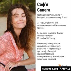Соф’я Сапега ляцела разам са сваім хлопцам Раманам Пратасевічам з адпачынку дадому. Самалёт нечакана пасадзілі ў Менску, абаіх маладых людзей затрымалі. Сапегу вінавацяць у дзеяньнях, якія яна нібыта зрабіла ў жніўні-верасьні 2020 году. Пакуль яна затрыманая на 2 месяцы.