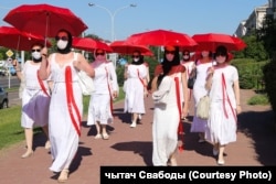 Чырвоная стужка на адзеньні жанчын сымбалізуе кроў з сэрца, чорны галаўны ўбор — жалоба аб загінулых, белыя сукенкі і парасон — знак чысьціні, лепшай будучыні, расказалі ўдзельніцы акцыі.