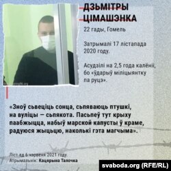- Затрымалі 16 кастрычніка 2020 году. Асудзілі на 2 гады калёніі за «пратэсты» і «гвалт над міліцыяй».