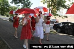 У нядзелю раніцай у цэнтры Менску жанчыны прайшліся з парасонамі колеру беларускага сьцяга. Іх сфатаграфаваў чытач нашага сайту.