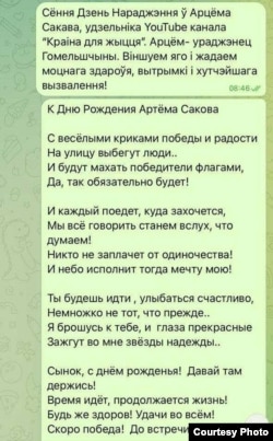 Палітвязьню Арцёму Сакаву, які працаваў апэратарам праекту «Страна для жизни», сёньня споўнілася 27 гадоў. Ужо другі дзень нараджэньня ён сустракае ў турме. Летась Арцём сядзеў у сталічным СІЗА-1 на Валадарскага. Цяпер над ім і іншымі фігурантамі справы ў гомельскай турме ідзе закрыты суд. Вядома, што Арцём трымаецца годна, спрабуе абараняць свае правы, дапамагае іншым вязьням.