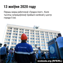 13 жніўня 2020 году сотні работнікаў «Гродна Азот» пасьля працы прайшлі калёнай у цэнтар гораду 5 кілямэтраў. Там далучыліся да іншых гарадзенцаў і рушылі па Горадні першым вялікім маршам пасьля пачатку пратэстаў.
