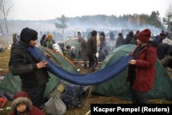Агенцтва Reuters апублікавала фота побыту мігрантаў на мяжы ў чацьвер, 18 лістапада. Многія працягваюць спаць пад адкрытым небам. Частцы ўдалося трапіць пад дах ангара транспартна-лягістычнага цэнтру, што побач з пунктам пропуску «Брузгі». Але месца хапіла ня ўсім.