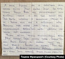 «Саша малайчына, трымаецца бадзёра і мяне стараецца падтрымаць празь лісты. У апошні час лісты пачалі затрымліваць, ужо тры тыдні няма. А так Саша не маркоціцца, нягледзячы на тое, што мае праблемы са здароўем: у яго адна нырка. Як і раней, Саша пісаў у лістах, каб я не хвалявалася, што гэта не назаўжды і што за чорнай ноччу заўсёды прыходзіць сьвітанак».