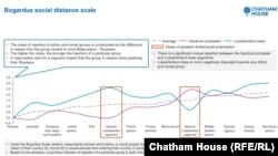 У лістападаўскім 2021 году апытаньні Chatham House задавалася пытаньне пра стаўленьне рэспандэнтаў да розных грамадзкіх групаў — этнічных, сацыяльных, палітычных. З дапамогай так званай шкалы сацыяльнай дыстанцыі Багардуса вымяралася, настолькі блізкія, прымальныя для апытаных прадстаўнікі тых ці іншых групаў.