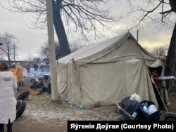 «Я адразу дастала ўсе дакумэнты пра мае затрыманьні, стала гучна казаць: „Я ў 2020-м зьехала, вось што са мной зрабіў Лукашэнка“. Прачытала свае дакумэнты памежніку, ён паставіў штамп у пашпарт. Польскую мяжу мы прайшлі адразу. Памежнікі сталі ўхутваць Сашку ў коўдру, даваць цёплую ежу, бутэрброды, гарбату, какаву. Вельмі шмат валянтэраў стаяла. Але агулам да беларусаў рэзка сталі дрэнна ставіцца. Я ня ведаю, як мы адмыемся. Украінцы не разумеюць, як так, чаму ад нас гэта ляціць. Я тлумачыла, што ў нас два гады тэрору, і што людзі выйшлі на выходных — гэта подзьвіг. Але яны не разумеюць абсалютна», — кажа Яўгенія.