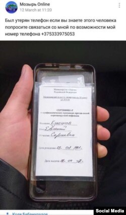 У мазырскіх пабліках ёсьць абвесткі пра знаходку мабільнага тэлефона, у футарале якога ляжаў сэртыфікат аб вакцынацыі ад каранавірусу. Сэртыфікат быў зроблены мэдпунктам вайсковай часткі 45123 Міністэрства абароны РФ. Частка разьмешчана ў горадзе Каменск-Уральскі Сьвярдлоўскай вобласьці. Гэта авіябаза вайсковай авіяцыі.