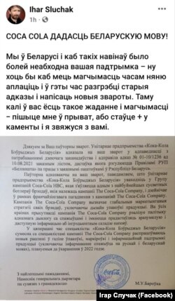 У пацьверджаньне таго, што неўзабаве ў гандлёвых сетках бутэлькі Coca-Cola будуць зь беларускай мовай на этыкетках, Случак апублікаваў у сваім фэйсбуку афіцыйны ліст кампаніі.