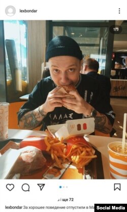 Учора блогер апублікаваў на сваім інстаграм-акаўнце фота, на якім ён есьць бургер, з подпісам: «За добрыя паводзіны выпусьцілі ў МакДональдс».