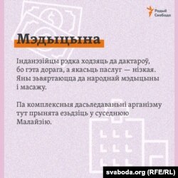 «Аднойчы я суправаджала ў шпіталь свайго сябра-інданэзійца з высокай тэмпэратурай, які меў страхоўку. Спачатку яму сказалі, што ў яго гастрыт, зрабілі іньекцыю і адправілі дадому. Яму лепш ня стала, у яго ўзялі кроў і сказалі, што яго ўкусіла дэнге (камарыха), выпісалі лекі на $100 і адправілі дадому. Калі мы прыехалі трэці раз, яму ўрэшце зрабілі тэст і выявілі, што гэта ковід. І гэта адзін з найлепшых шпіталёў у горадзе. Гэта адна з прычын, чаму тут ня ходзяць да дактароў, — дорага і малаякасна», — расказвае дзяўчына.