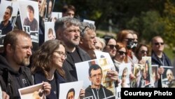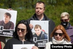 Удзельнікі акцыі ў Вільні трымалі партрэты зьняволеных у Беларусі журналістаў. Год таму ў турмах Беларусі было 24 журналісты. Цяпер у месцах зьняволеньня знаходзяцца 33 прадстаўнікі мэдыя. І гэта з улікам таго, што апошнім часам некаторых журналістаў вызвалілі.