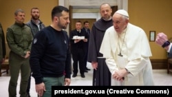 «Пры ўсёй павазе да Папы, нам патрэбен не пасярэднік паміж Украінай і агрэсарам, які акупаваў нашы тэрыторыі, а плян дзеяньняў для ўстанаўленьня справядлівага міру ва Ўкраіне», – заявіў прэзыдэнт Украіны ў эфіры італьянскага ТБ пасьля сустрэчы з папам рымскім.