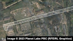 Сёньняшні спадарожнікавы здымак ад кампаніі Planet Labs, зроблены раніцай у 11.12 па менскім часе, паказаў яшчэ адну буйную калёну, пэўна, што байцоў «Вагнэра», якая прыбыла ў вайсковую частку ў вёсцы Цэль, дзе стаіць намётавы лягер.