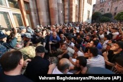 Пратэстоўцы выкрыкваюць лёзунгі супраць ураду і патрабуюць ад прэм’ер-міністра Нікола Пашыньяна ўмяшаньня ў сытуацыю. Пратэстоўцы кідалі бутэлькі ў сілавікоў, якія ачапілі будынак армянскага ўраду, а затым пачалі спробу яго штурму. Пры гэтым яны выгукалі: «Нікол — здраднік!». Яшчэ адна група пратэстоўцаў зладзіла акцыю насупраць расейскай амбасады. Удзельнікі пратэсту патрабавалі, каб расейскія міратворцы, якія знаходзяцца ў рэгіёне, абаранілі мірнае насельніцтва ад агрэсіі.