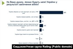 У верасьнёўскім 2023 году апытаньні Rating большасьць рэспандэнтаў (68%) выказвалі ўпэўненасьць, што ў выніку заканчэньня вайны Ўкраіна захавае ўсе тэрыторыі, якія мела ў 1991 годзе.