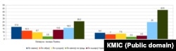 Пяройдзем цяпер да вынікаў вывучэньня грамадзкай думкі ва Ўкраіне. Наступны графік, на якім прадстаўленыя вынікі апытаньняў Кіеўскага міжнароднага інстытуту сацыялёгіі (КМІС), паказвае, што грамадзкая думка Ўкраіны на працягу вайны адмоўна ставілася да магчымасьці тэрытарыяльных саступак.