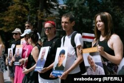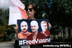 У руках пікетоўцы трымалі расьцяжку #FreeViasna і партрэты пяці праваабаронцаў «Вясны», якіх беларускія ўлады працягваюць трымаць за кратамі. Гэта старшыня праваабарончага цэнтру «Вясна» Алесь Бяляцкі, ягоны намесьнік Валянцін Стэфановіч і юрыст «Вясны» Ўладзімер Лабковіч, якіх арыштавалі акурат 3 гады таму, 12 ліпеня 2021 году ў Менску.