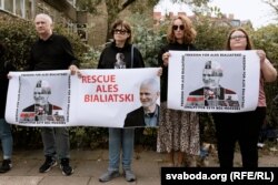 Алесь Бяляцкі ў зьняволеньні ўжо больш за 3 гады — яго арыштавалі 14 ліпеня 2021 году і асудзілі на 10 гадоў калёніі. У руках пікетоўцаў, якія прыйшлі да «муралу Бяляцкага», сярод іншых плякатаў былі і тыя, на якіх па-ангельску было напісана: «Уратаваць Алеся Бяляцкага».