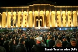Галоўную вуліцу Тбілісі, праспэкт Руставелі, увечары 28 кастрычніка перакрылі ўдзельнікі мітынгу. Як паведамляе RusNews, на плошчы каля грузінскага парлямэнта сабраліся «тысячы пратэстоўцаў», людзі працягваюць падыходзіць. У натоўпе бачныя сьцягі Грузіі, Украіны і Эўразьвязу.
