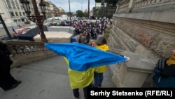 Яны трымалі ўкраінскія і чэскія сцягі. Яны па чарзе крычалі «Расея — лайно» і «Слава Ўкраіне».