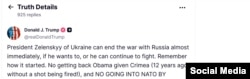 «Зяленскі можа спыніць вайну з Расеяй амаль імгненна, калі захоча, або можа працягваць ваяваць. Памятаеце, як усё пачалося. Ніякага вяртаньня Крыму, які [прэзыдэнт ЗША] Абама аддаў (12 гадоў таму, без адзінага стрэлу!), і НІЯКАГА ЎСТУПУ ЎКРАІНЫ Ў NATO. Пэўныя рэчы ніколі не мяняюцца», — напісаў Дональд Трамп у сваёй сацыяльнай сетцы Truth Social.