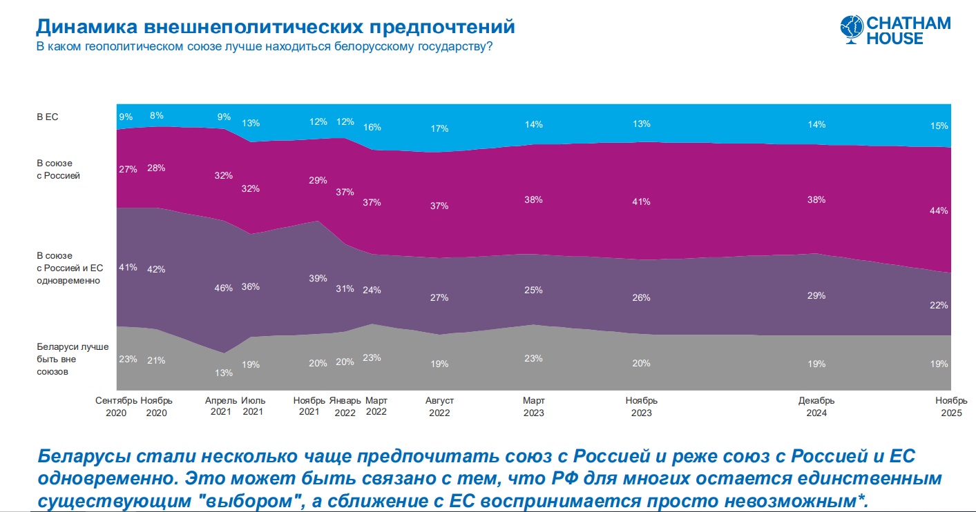 — Пытаньне адносна невялікай групы людзей, якія за саюз з Расеяй, але пры гэтым не падтрымліваюць дзеяньні Расеі ў гэтай вайне. Як гэта спалучаецца? Гэтыя людзі ўспрымаюць сытуацыю так, што ў іх няма выбару. Мяжа адчыненая толькі ў адзін бок. Гандляваць Беларусь можа фактычна толькі з адной краінай. Для многіх гэта важна. І чалавек можа быць прарасейскіх поглядаў, але быць супраць вайны.