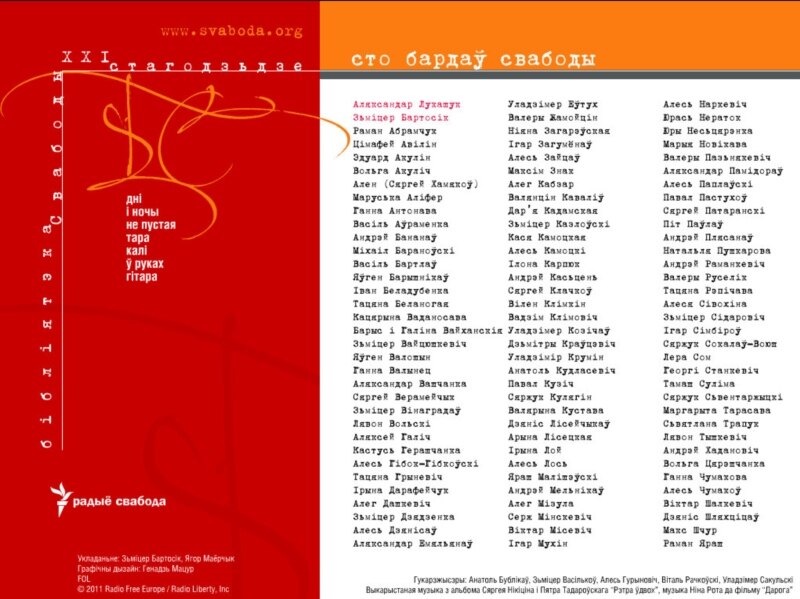 Вядучы канцэрту Зьміцер Бартосік у адказ прадставіў новы мультымэдыйны DVD-дыск «100 бардаў Свабоды». Цягам амаль двух гадоў кожны тыдзень на Радыё Свабода запісваліся барды, — і вядомыя, раскручаныя, і зусім маладыя, пачаткоўцы. З найлепшых іх твораў год таму склалі дыск «50 бардаў Свабоды». І вось выйшла ўжо «100 бардаў Свабоды» — на ім сотня гутарак з бардамі, а таксама паўтысчы песьняў.