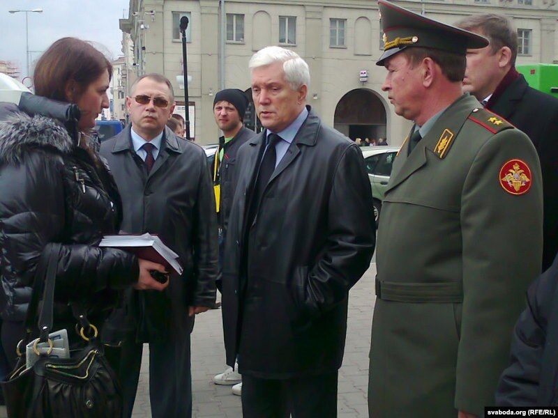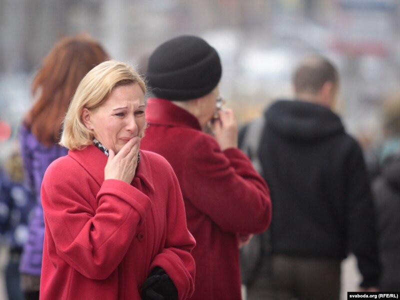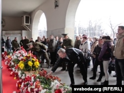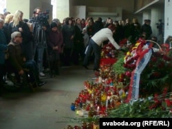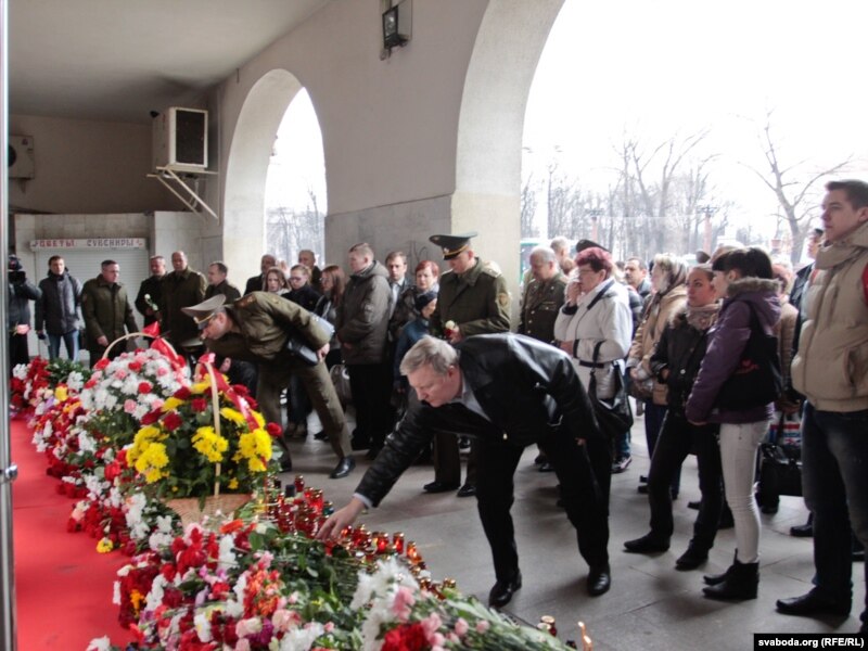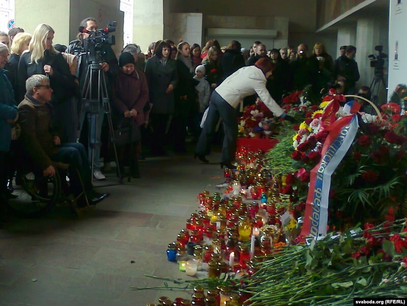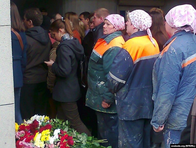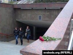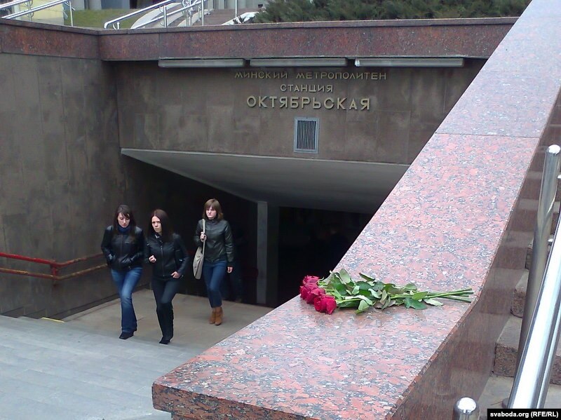 Уваходы на станцыю мэтро «Кастрычніцкая» паабапал праспэкту Незалежнасьці ахоўваюць супрацоўнікі АМАПу. Мэтро не працуе, і людзі нават не спрабуюць туды зайсьці. Яны ўскладаюць кветкі, запальваюць зьнічы, моўчкі стаяць. Тут таксама багата журналістаў, якія фіксуюць усё, што тут адбываецца. Доўга знаходзіўся каля жалобнага месца чалавек у інвалідным вазку, які пра сваю прысутнасьць сказаў так:
