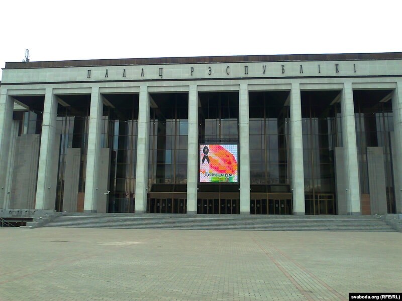 За два крокі ад станцыі мэтро «Кастрычніцкая» — аднайменная плошча з Палацам рэспублікі, дзе над уваходам — вялікі экран з выяваю дзяржаўнага сьцяга і чорнай стужкай з надпісам «Дзень жалобы». Чорныя стужкі таксама на сьцягах, вывешаных на дзяржаўных будынках. Побач з Палацам рэспублікі — машына хуткай дапамогі, пажарная машына, аўтазак і аўтобус зь цёмным шклом.