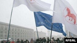 13.04 На Кастрычніцкай плошчы зьявіліся бел-чырвона-белыя сьцягі і сьцягі руху “За Свабоду”. Перад удзельнікамі мітынгу выступілі лідэр АГП Анатоль Лябедзька, прадпрымальнікі, людзі, якія назваліся наёмнымі работнікамі. Супрацоўнікі міліцыі ў мэгафоны папярэджваюць людзей аб забароне выходзіць на праезную частку і ладзіць шэсьце. На самой плошчы ў гэты час БРСМ праводзіць моладзевыя конкурсы