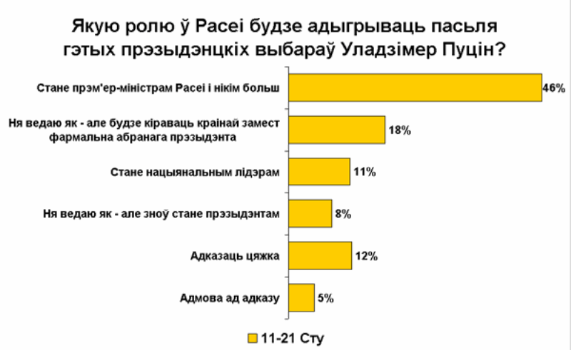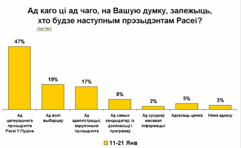 Вынікі выглядаюць парадаксальна: 45% апытаных выказваюць сумневы ў тым, што выбары пройдуць сумленна, 65% мяркуюць, што адказ на пытаньне, хто будзе наступным прэзыдэнтам, залежыць ад Уладзімера Пуціна і ягонай адміністрацыі, і толькі 19% мяркуюць, што гэта будзе залежаць ад волі выбаршчыкаў. І разам з тым тры чвэрці апытаных кажуць, што пойдуць галасаваць, пры гэтым 45% апытаных чакаюць ад прэзыдэнцкіх выбараў лепшага жыцьця для сябе і сваёй сям’і і прыкладна столькі ж – падвышэньня пэнсіяў і заробкаў.