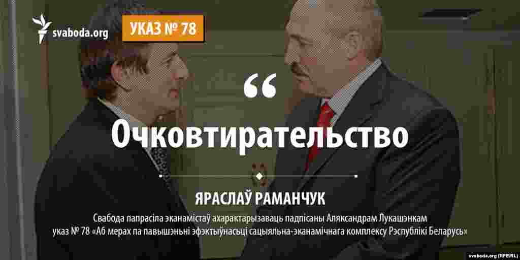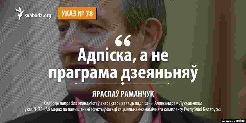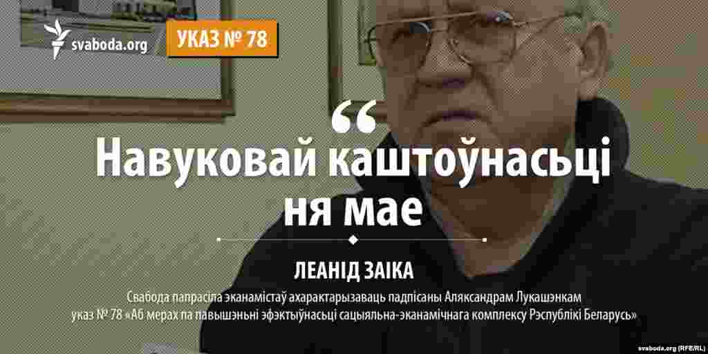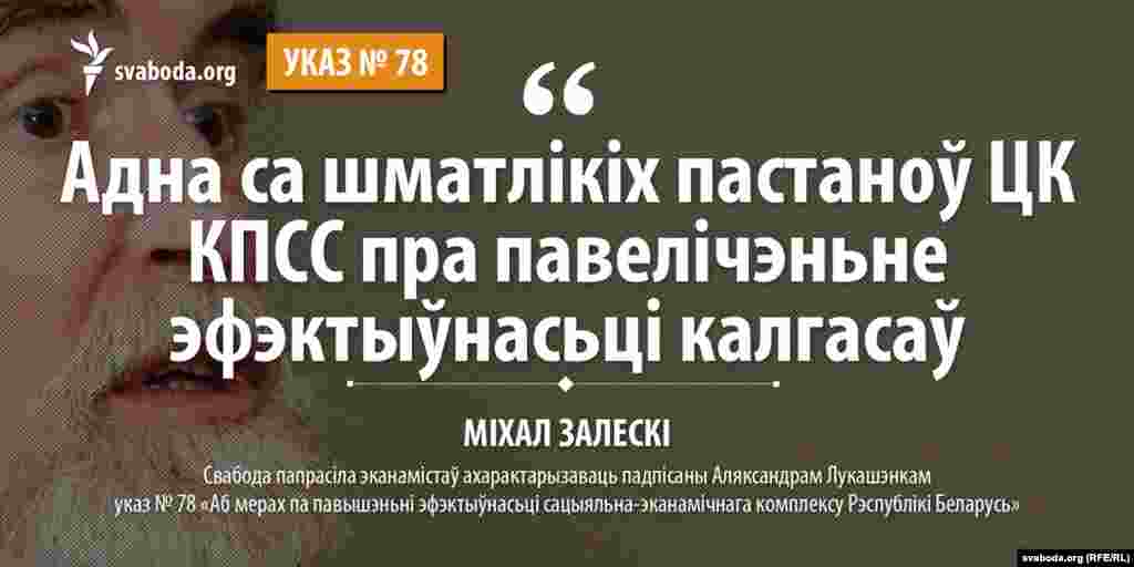 Эканамічныя экспэрты не шкадавалі словаў, каб ахарактарызаваць для Радыё Свабода падпісаны Аляксандрам Лукашэнкам указ № 78 «Аб мерах па павышэньні эфэктыўнасьці сацыяльна-эканамічнага комплексу Рэспублікі Беларусь». Указ, які мае на мэце забясьпечыць «эканамічную бясьпеку» і «сацыяльную стабільнасьць», абавязвае, сярод іншага, зьнізіць сабекошт прадукцыі на дзяржпрадпрыемствах ня менш як на 25%, нарасьціць і дывэрсыфікаваць экспарт, забясьпечыць «рацыянальнае імпартазамяшчэньне», нарасьціць золатавалютныя рэзэрвы «да эканамічна бясьпечнага ўзроўню» і г.д.