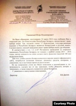 «У адносіну да Вашых прапаноў паведамляем, што сгодна з ст. 7 Канстітуцыі дзяржаўнай мовай у нас з’яўляюцца беларуская і руская. Акрамя таго, сгодна з перапісам насельніцтва на 14 кастрычніка 2009 года ў г. Брэсце пражывала 309,8 тыс. чалавек. Асноўнай мовай, выкарыстовываемай для зносін, з’яўляецца руская. На ёй звычайна размаўляюць дома 291,5 тыс. чалавек (94,1% насельніцтва гррада), з іх 241,2 тыс. чалавек беларусаў <...> Пры змене моўнай сітуацыі ў г. Брэсце і эканамічнай у клубе ФК „Брэст“ Вашы прапановы па магчымасці будуць рэалізаваны.»