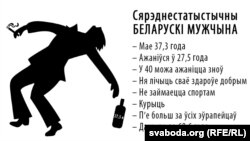 Толькі 33,1% беларускіх мужчын лічаць сваё здароўе добрым. Пры гэтым 46,6% кураць, а спортам ці фізкультурай займаюцца 26,2%. Што ня згадваецца ў аглядзе — гэта тое, што беларускі мужчына, хутчэй за ўсё, выпівае: у 2010 годзе Ўсясьветная арганізацыя здароўя назвала Беларусь абсалютным лідэрам па спажываньні алькаголю з 17,32 літра чыстага сьпірту на чалавека (узростам ад 15 гадоў) на год (на мужчыну — 27,5 л). Пазьней улады сьцьвярджалі, што ўжываньне алькаголю зьнізілася па выніках 2014 году да 15 л. На 1000 беларусаў 2 упершыню захварэлі на алькагалізм і сталі на ўлік у 2015 годзе.