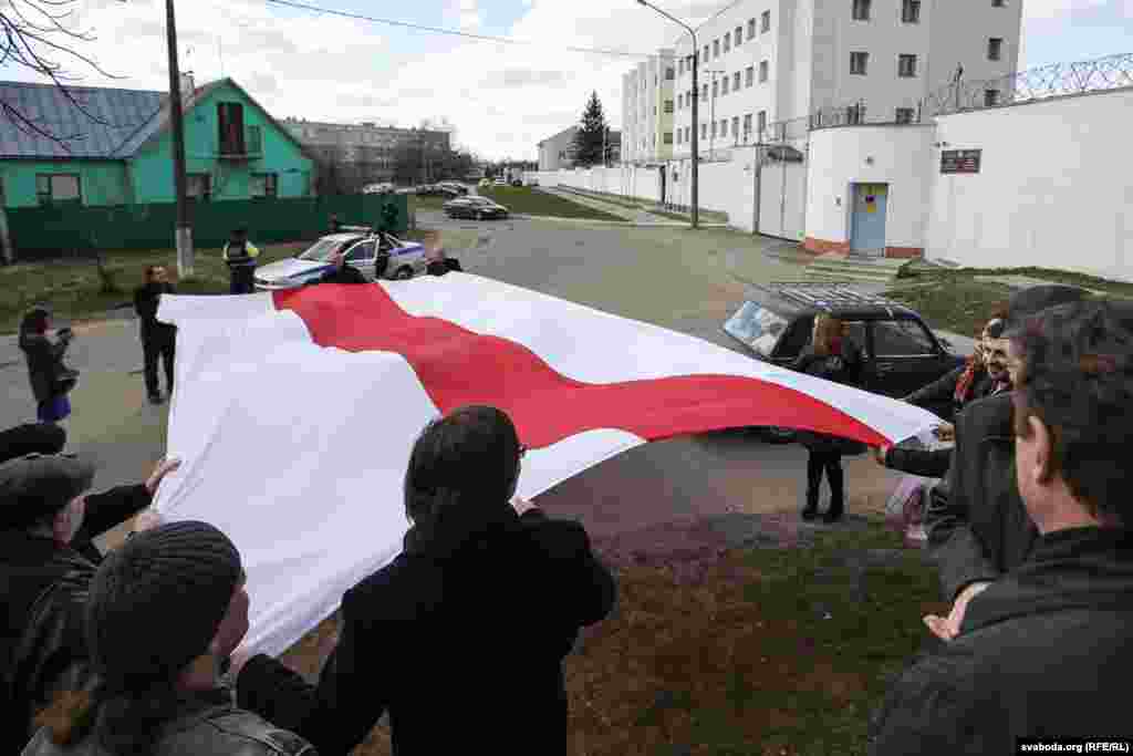 Актывісты якія сустракалі арыштаваных, прынесьлі да сьценаў турмы вялікі бел-чырвона-белы сьцяг, які не пасьпелі разгарнуць 25 сакавіка.