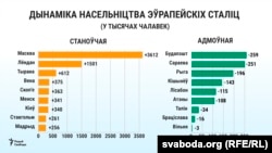 Поруч з эўрапейскімі сталіцамі апынуліся й Горадня зь Берасьцем. Яны вырасьлі, адпаведна, на 85 і 67 тысяч чалавек — і гэта больш, чым маюць Прага (плюс 65 тысяч), Бухарэст (плюс 42), Заграб (плюс 29), Рэйк’явік (плюс 23) і два дзясяткі іншых.