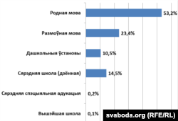 Чым вышэйшы ўзровень адукацыі, тым больш радыкальна — да нуля — звужаюцца магчымасьці вучыцца па-беларуску. Толькі палова дзяцей зь беларускамоўных сем’яў можа вучыцца па-беларуску ў школе (да таго ж пераважна ў вёсцы, а ў гарадах гэты працэнт куды меншы ды часта імкнецца да нуля).