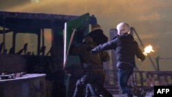 Раніцай у панядзелак на вуліцы Грушэўскага ў Кіеве некалькі сотняў пратэстуючых б’юць у барабаны і спрабуюць кідаць у бок спэцатраду міліцыі камяні.
