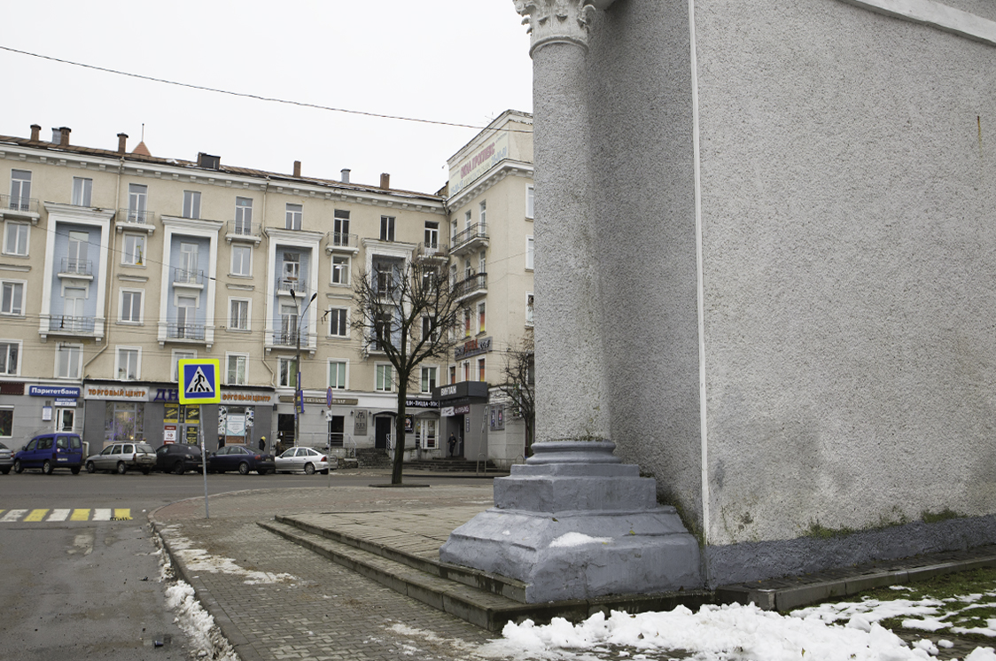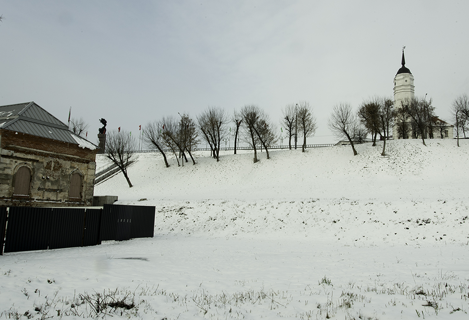 Справа на фота відаць купал Пакроўскай царквы. Праваслаўную сьвятыню разбурылі паміж 1952 і 1956 гадамі. Цяпер яе аднаўляюць