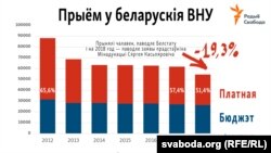 Але асноўнае зьмяншэньне набору адбываецца за кошт платных месцаў. Летась набіралі 61,8 тысячы студэнтаў, цяпер плянуецца набраць толькі 54,5 тысячы. На бюджэтную форму аплаты плянуюць прыняць каля 26,5 тысячы студэнтаў (папярэднія пяць гадоў колькасьць бюджэтнікаў паступова зьніжалася з 31,7 тысячы ў 2012 годзе, 28,3 тысячы ў 2013-м), але на платную форму набор скароціцца амаль на 20% — такое рэзкае зьмяншэньне было ў 2012 годзе. Калі ў тым 2012-м «платнікаў» было 65,6% ад усіх набраных студэнтаў, цяпер мае быць толькі 51,4%.