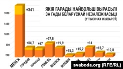 Мы адзначылі буйны рост — больш чым на 10 тысяч жыхароў — у 10 гарадах. Менск прыбавіў прыкладна на 341 тысячy, Горадня — на 85, Берасьце — на 67, Гомель — на 38, Віцебск — на 20. З гэтага вынікае, што два заходнія абласныя цэнтры неўзабаве могуць абысьці колькасьцю насельніцтва Віцебск і Магілёў, але далей — яшчэ цікавей. Магілёў з ростам у 14 тысяч жыхароў абагналі нават Жлобін і Пінск, кожны зь якіх прырос на 15 тысяч. Таксама ў топ-10 Баранавічы з ростам на 13 тысяч і Салігорск — з ростам на 11 тысяч. З гарадоў — не раённых цэнтраў значным ростам зьдзівіла Жодзіна, дзе стала жыць больш на 8 тысяч чалавек.